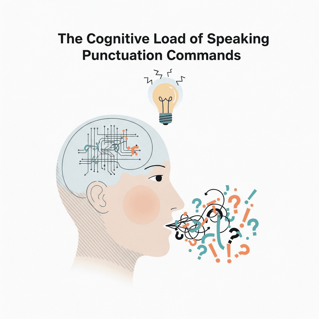 This creates a mental juggling act. You're simultaneously thinking about what you want to say, remembering to verbalize punctuation, and trying to maintain your original thought. Research shows that punctuation commands impact the dictation experience, especially for longer documents or complex writing.
