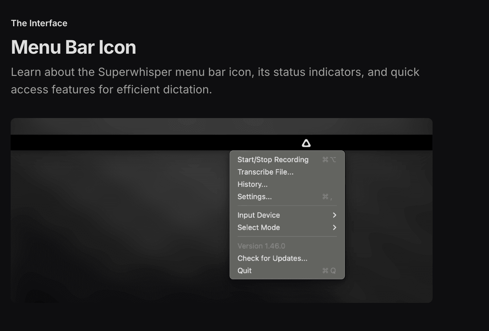 Superwhisper operates through keyboard shortcuts and menu bar integration, offering customizable AI models ranging from fast processing to high-accuracy options. You can choose between Nano, Fast, Pro, and Ultra models depending on your accuracy needs versus processing speed preferences.